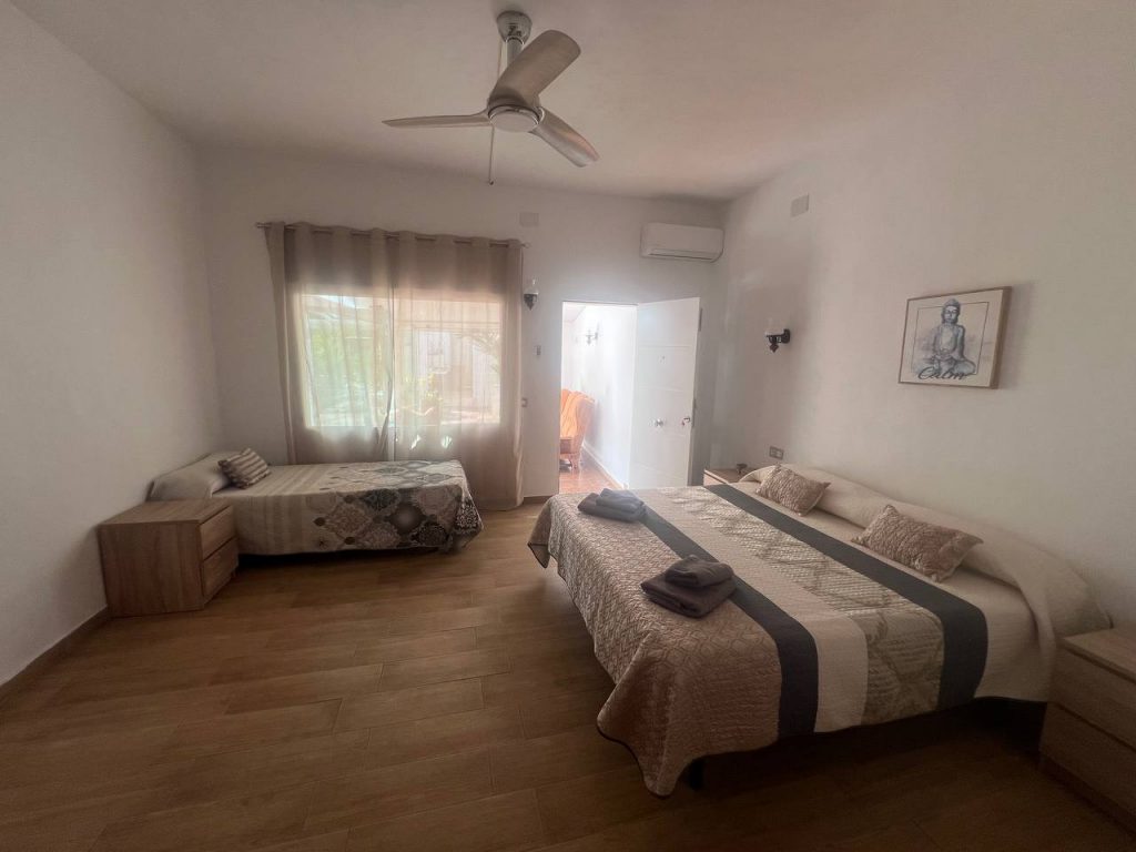 Ubicada en la planta baja, a pasos de la piscina, nuestra habitación calma cuenta con una cama doble y una individual, y el plus de un living exterior privado con vista al Montgó.